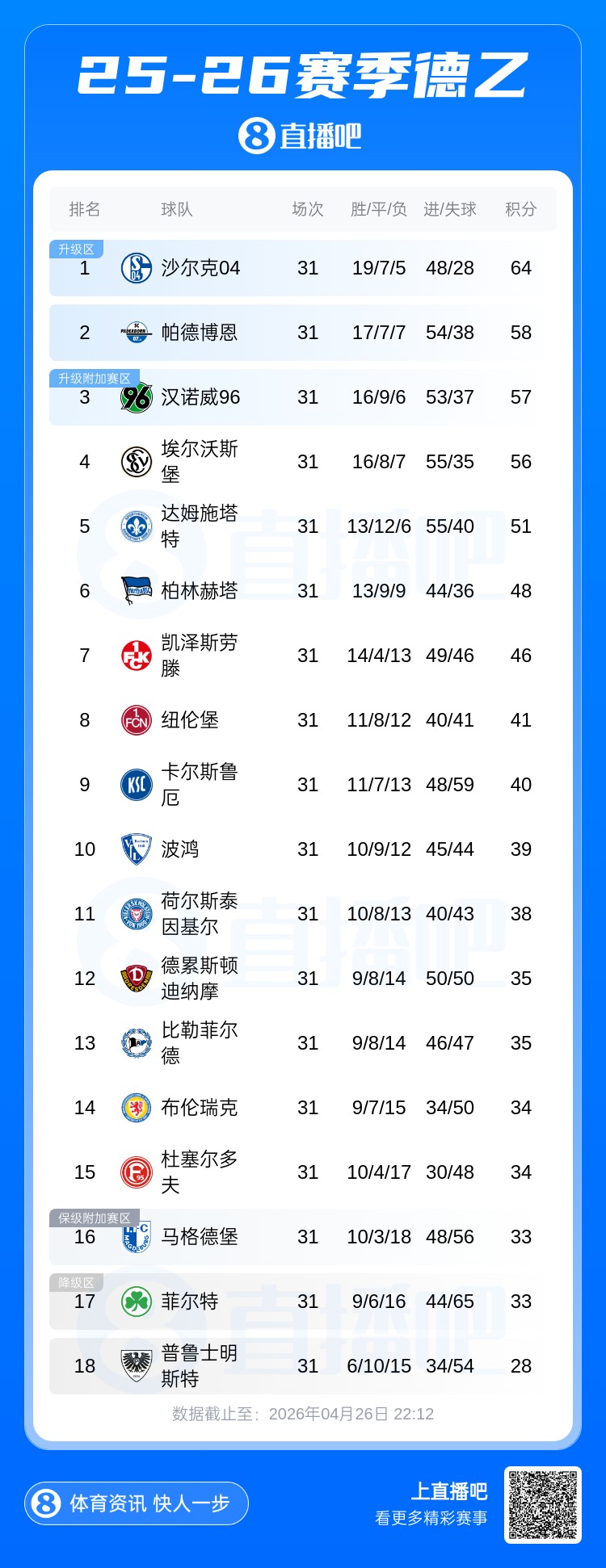 按照规则,赛季结束后德乙前两名直接升级,第三名和德甲倒数第三进行两回合升降级附加赛。下一轮沙尔克04只要主场战胜杜塞尔多夫,就将提前两轮确定升级。
