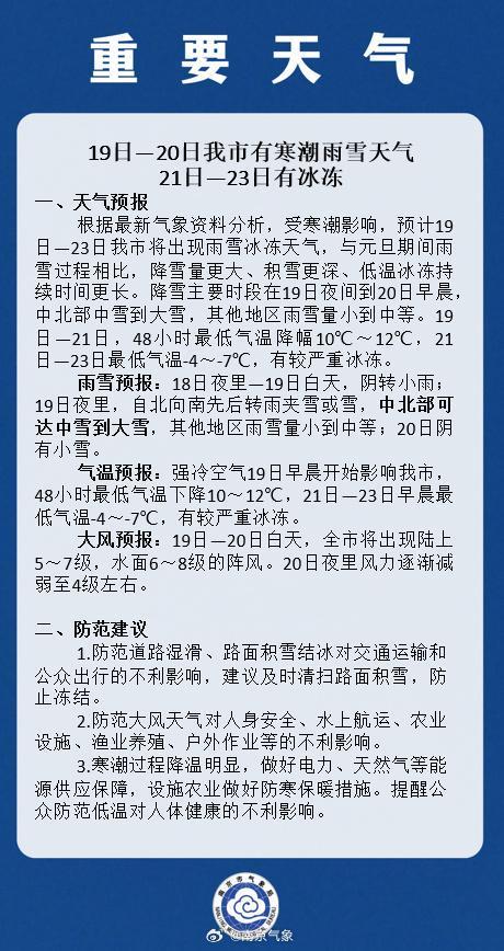 据江苏气象消息,18日夜里到19日我省将有寒潮、大风和雨雪天气。明晨我省东南部地区局部有雾或浓雾。