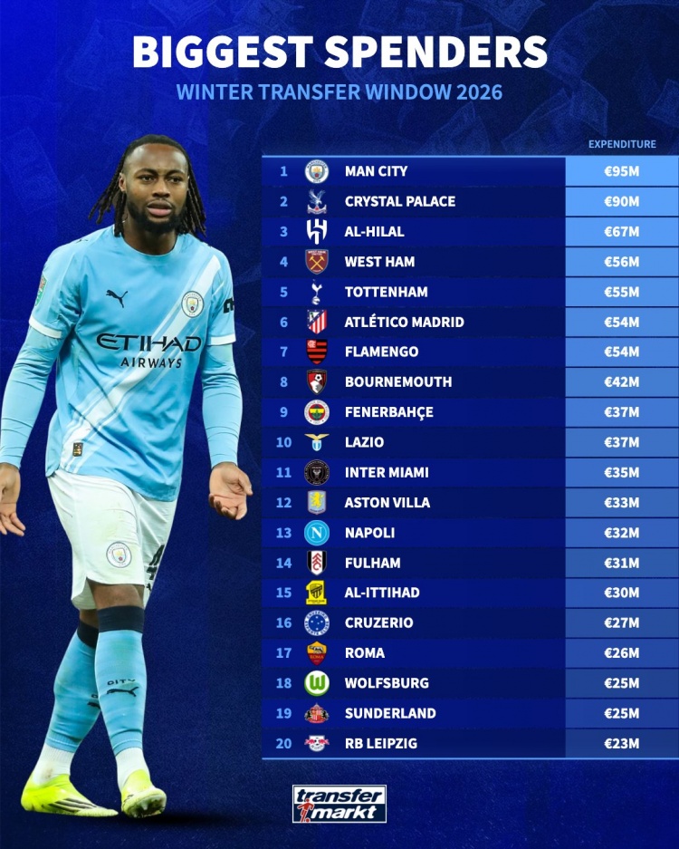 2月4日讯 冬季转会窗已经关闭,德国转会市场盘点了足坛各队引援花费情况,曼城以9500万欧居首,水晶宫以9000万欧位居次席。