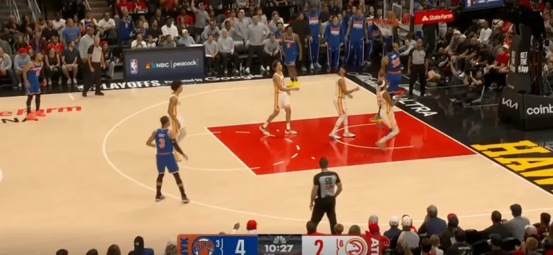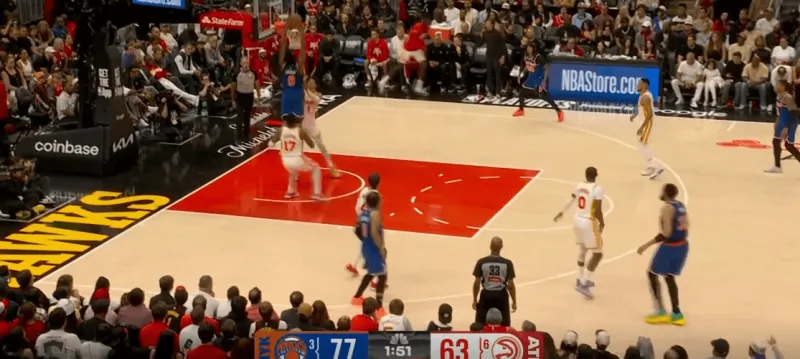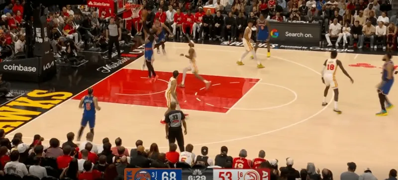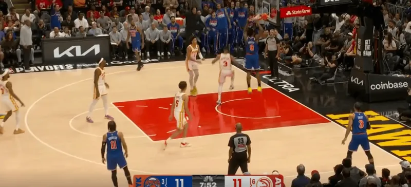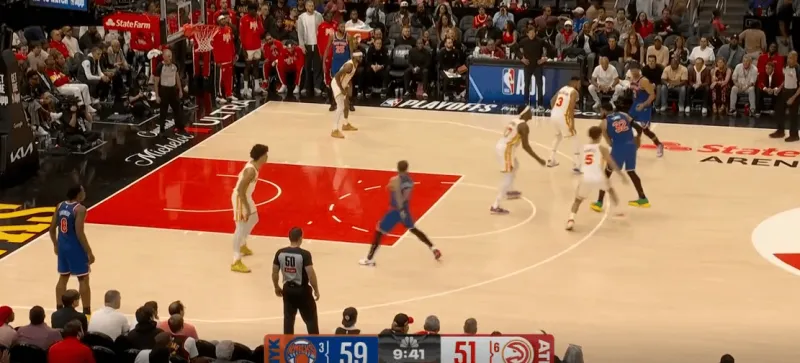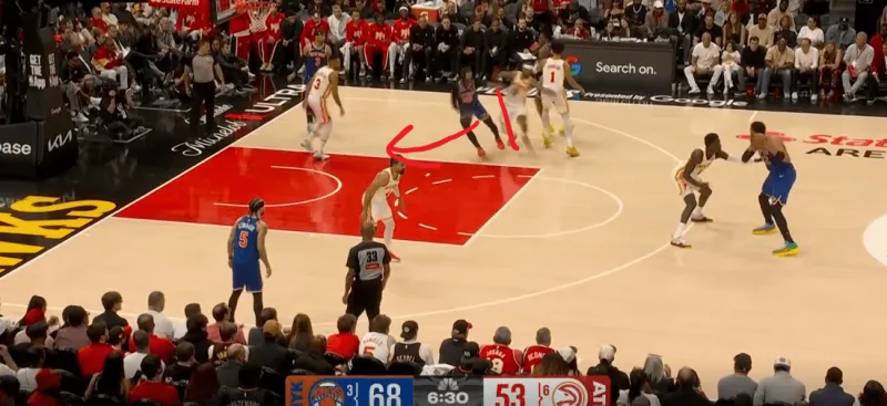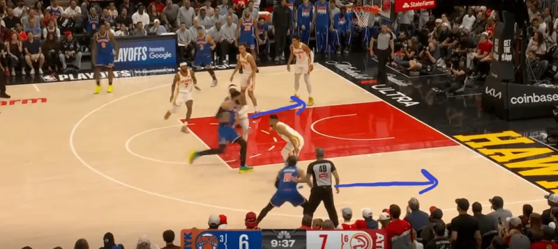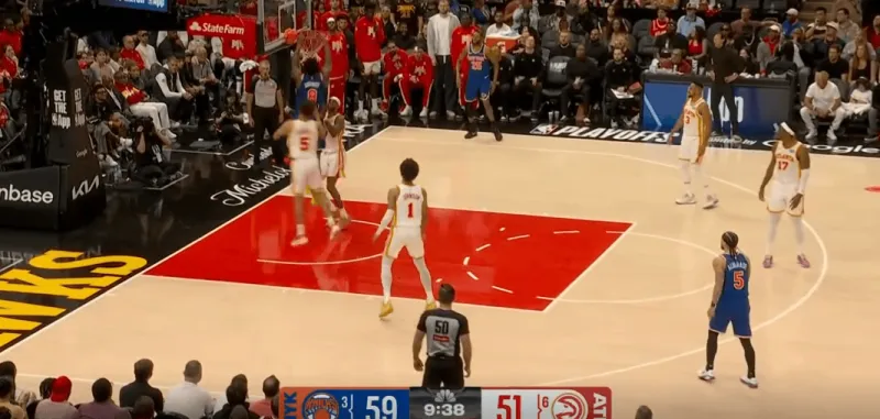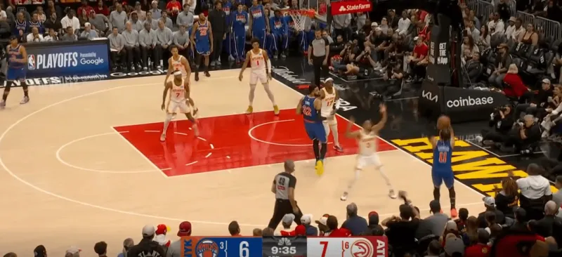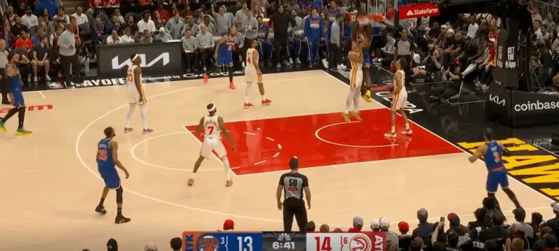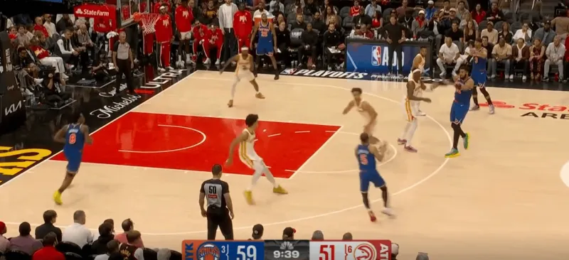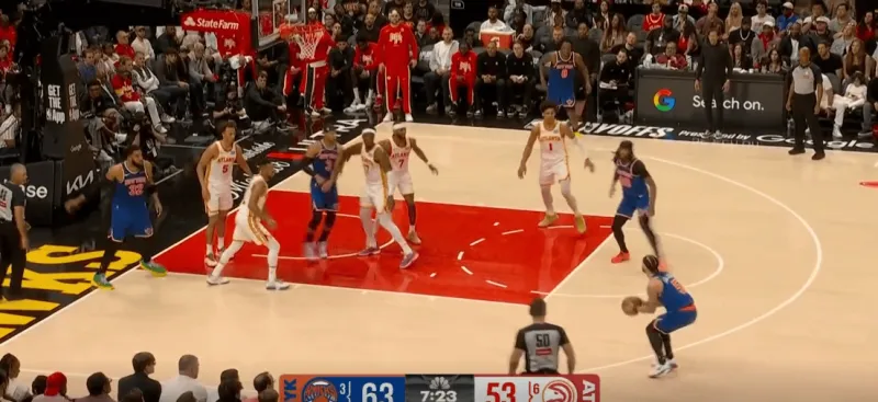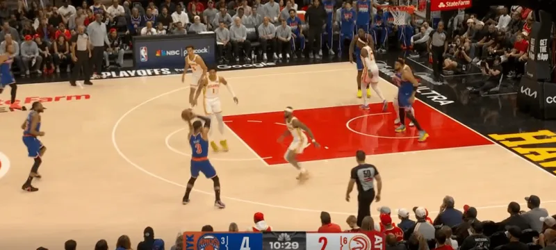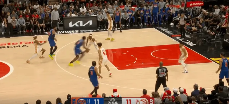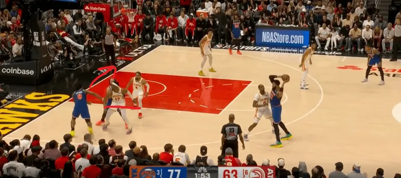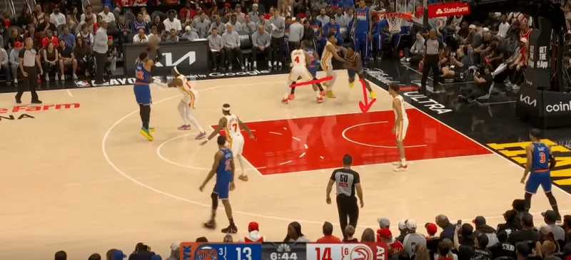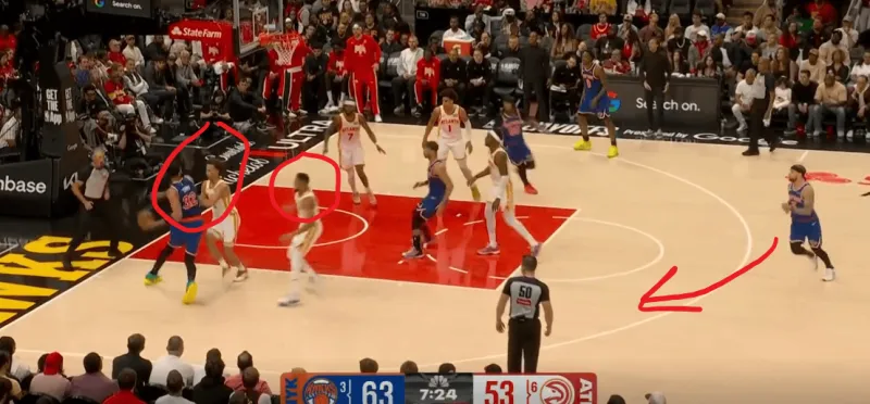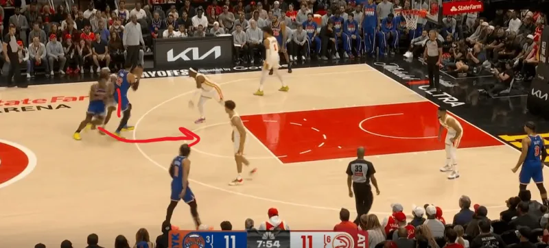 唐斯高位面筐一对一对抗奥孔古,突破时遭遇右侧麦科勒姆协防刷卡,布伦森同时向底角移动重新落位,唐斯收球后发现队友送出助攻: